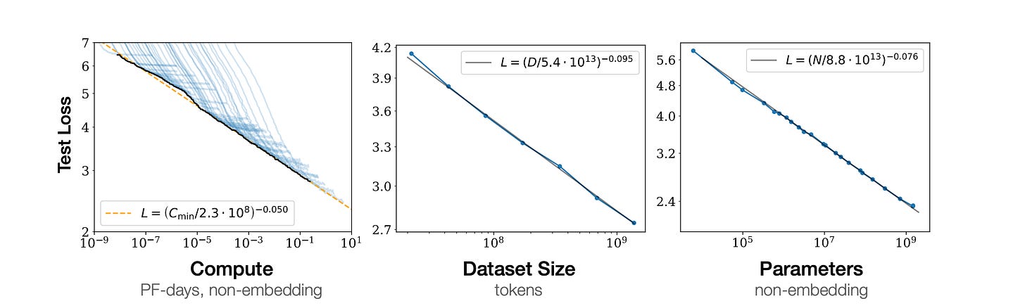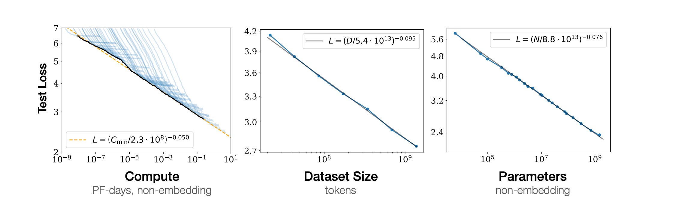 Kaplan et al.’s figures which beautifully highlighted a power law relationship between test loss and compute, dataset size, and parameter count may be ones we reminisce about for decades to come.